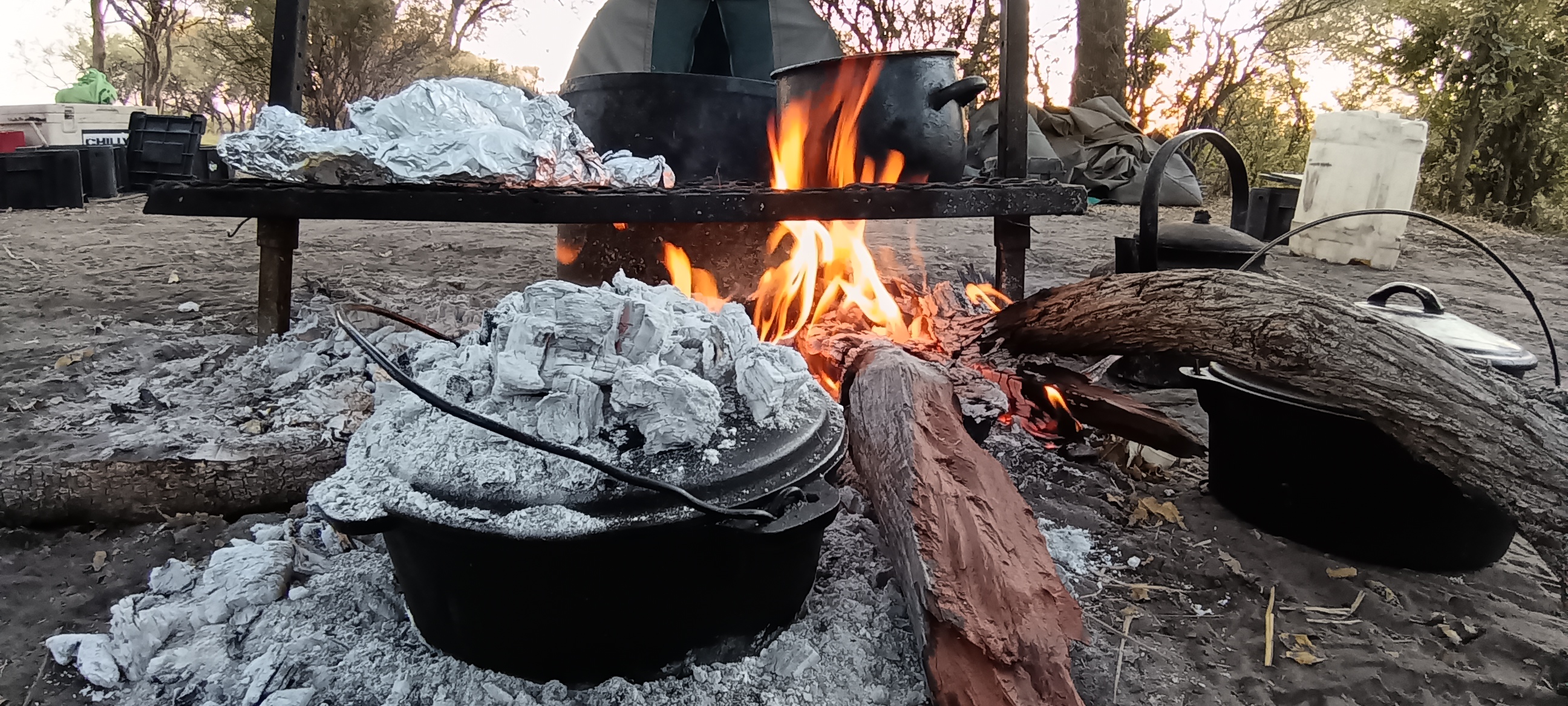 We spent two nights at the end of April 2018 in Okavango at the Oddballs enclave on a small island in the heart of Okavango just next to the airstrip. Respectful of the environment, the camp has five tents discreetly nestled into the environment but with the luxury of a comfortable bed, private and original shower and toilet, great food, etc. The floods hadn't yet arrived so we couldn't go on a full safari by mokoro (wooden canoe), but we did experience a short ride across an outlet during an early morning walking safari that lasted around three hours and that was an experience in itself. While the water was shallow and lotus flowers flourished, I felt a bit anxious about the fact that we may not be alone in the water ... The highlight of this three-hour walking safari was a male lion resting in the shade at around 40 metres from where we were standing. It's a place to communicate with mother nature and contemplate on its beauty. Safaris at this camp are by foot or by mokoro so the only noises are those of the animals, hippos in particular. The grasses at the end of April were high and lush. The red and orange colours at sunrise and sunset simply breathtaking. The highlight of our last morning on the island were a family of hippos at sunrise on the banks and in the water of the Moremi River.