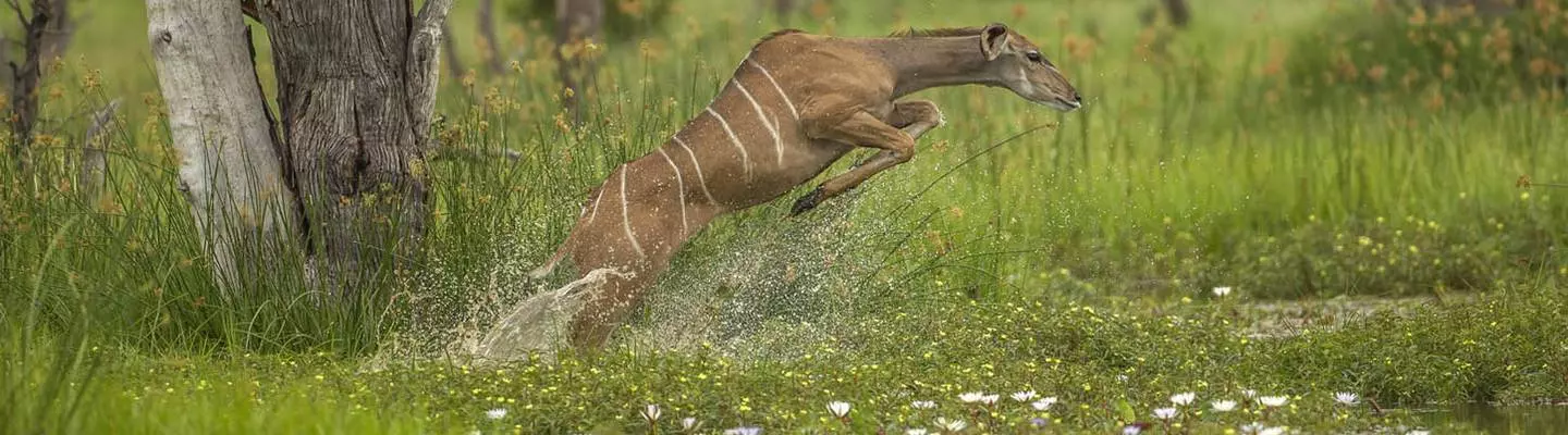 The Okavango Delta is home to a large variety of antelope including lechwe, tsessebe, sitatunga, roan antelope, reedbuck, greater kudu, sable antelope, springbok and impala. The lechwe antelope is the most common large mammal, with more than 60,000 inhabiting the delta. These swamp-dwelling antelopes, slightly larger than an impala, bound effortlessly through the swamp due to the natural water-repellent quality of the fur on their legs. They frolic freely in the water, seeming lighter than air as their dancing leaps provide not just forward movement but raise them to heights from which they can spy danger. The rarest aquatic antelope found in the Okavango is the demure sitatunga, which hides from predators by sinking into the water with just its nostrils showing. It can even sleep under water like this!