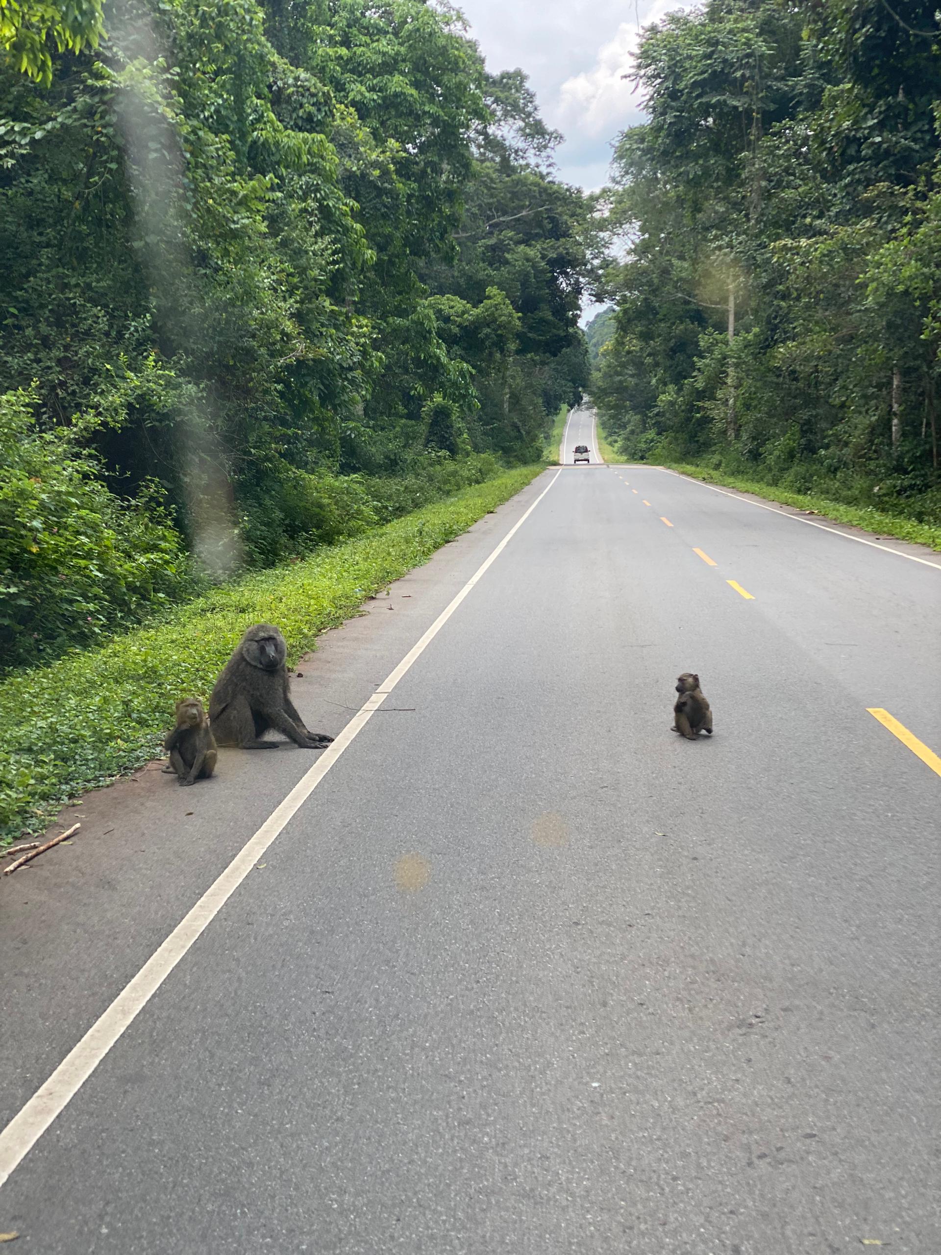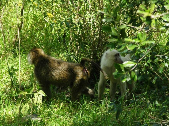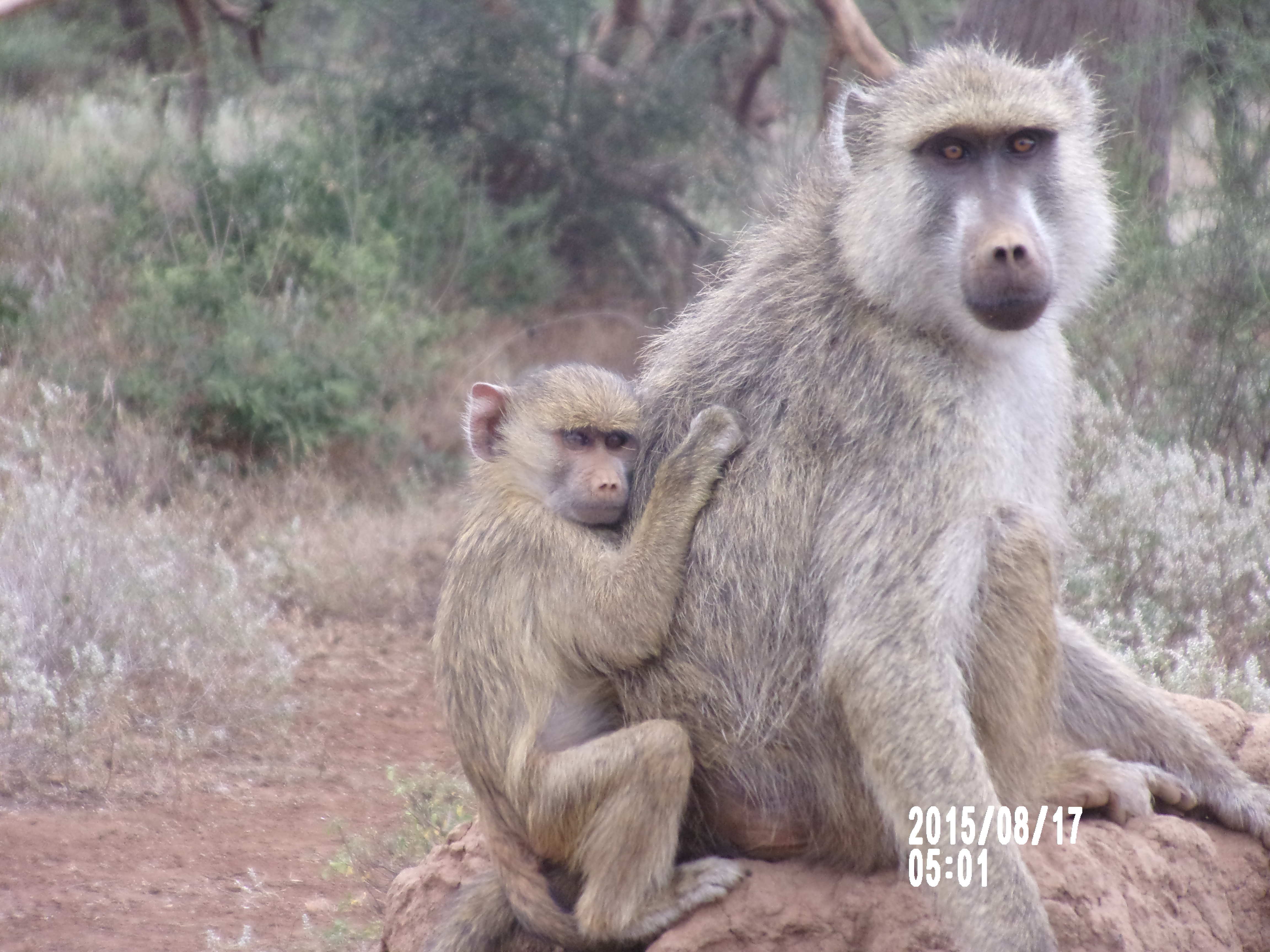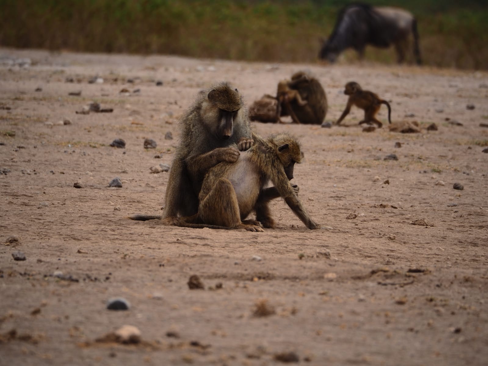 Baboons are extremely adaptable and can be found in a wide variety of terrains. In Africa, they are primarily found in open savannah, open woodland and hills. Like many primates, baboons are highly social. They live in social groups of around 20 to 150 animals, including several adult females and males, and many offspring. Compared to many other monkeys, baboons are unusual in that they spend most of their waking hours on the ground. Baboons are technically omnivores, but the majority of their diet consists of plants. They have been known to consume insects and periodically go after fish, insects, shellfish, rabbits, fowls, monkeys and antelope. They are foragers and can be very aggressive when food is involved. Baboons and humans have a genetic similarity of 94%. A baboon female has a gestation period of about 180 days, or just under six months, and gives birth to just a single young.
