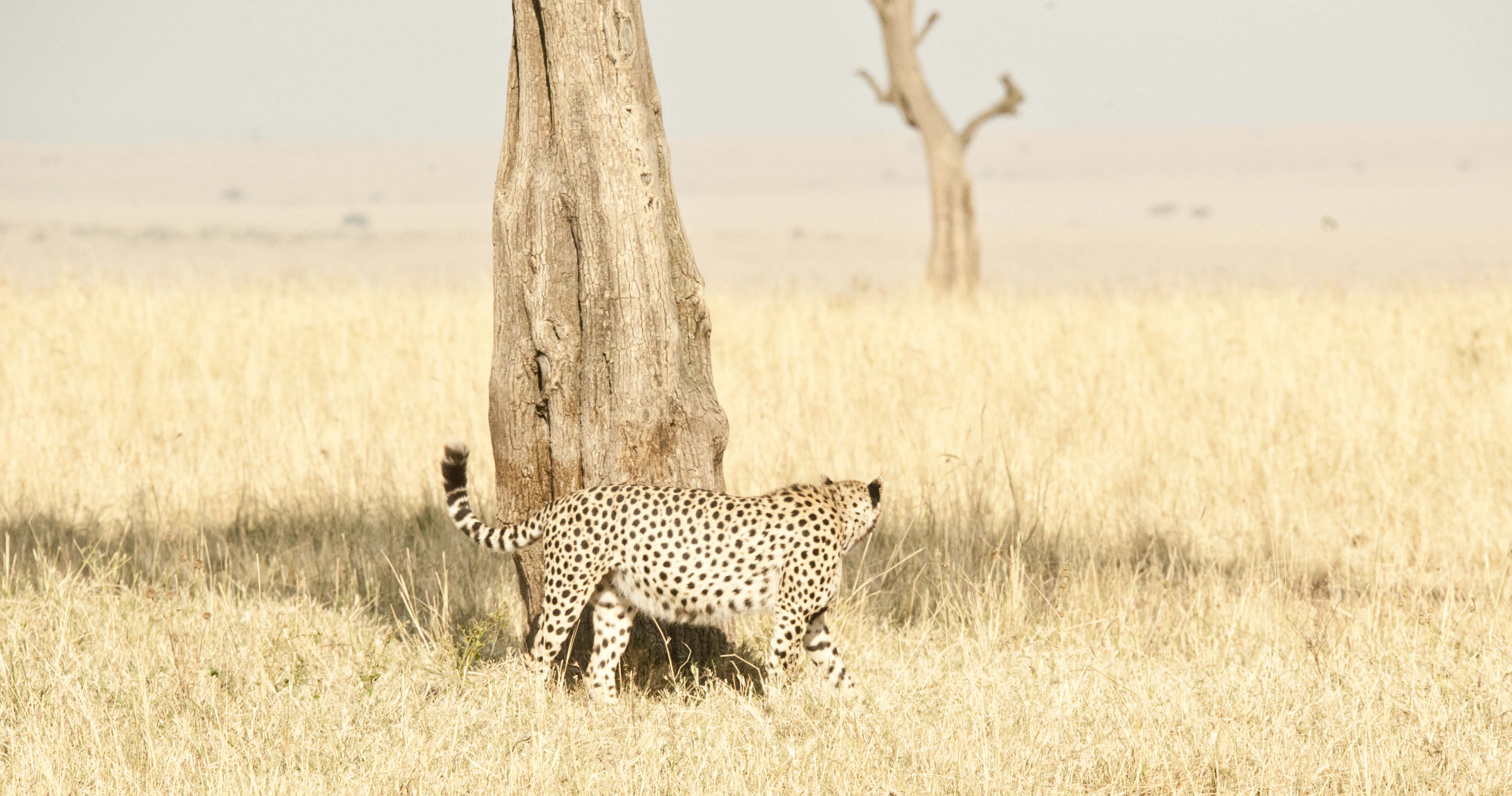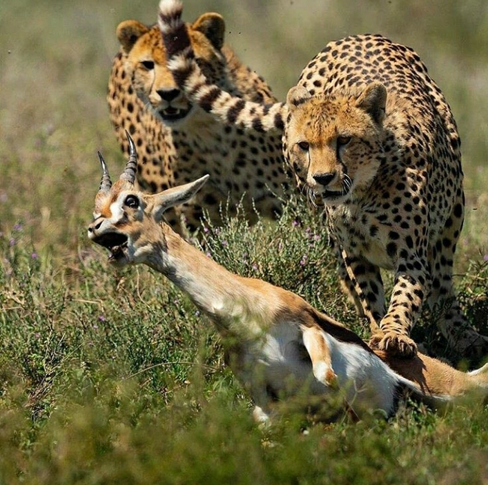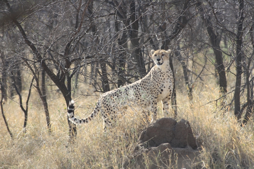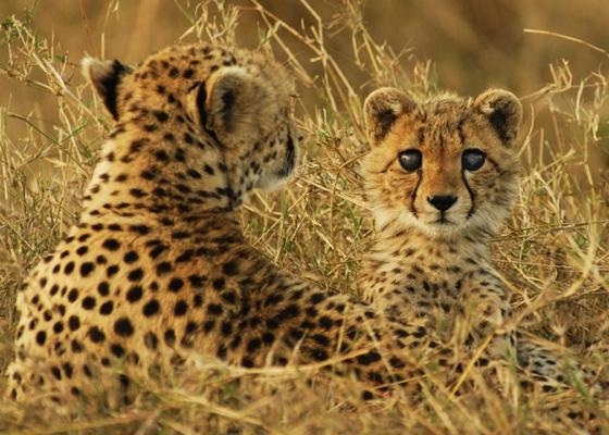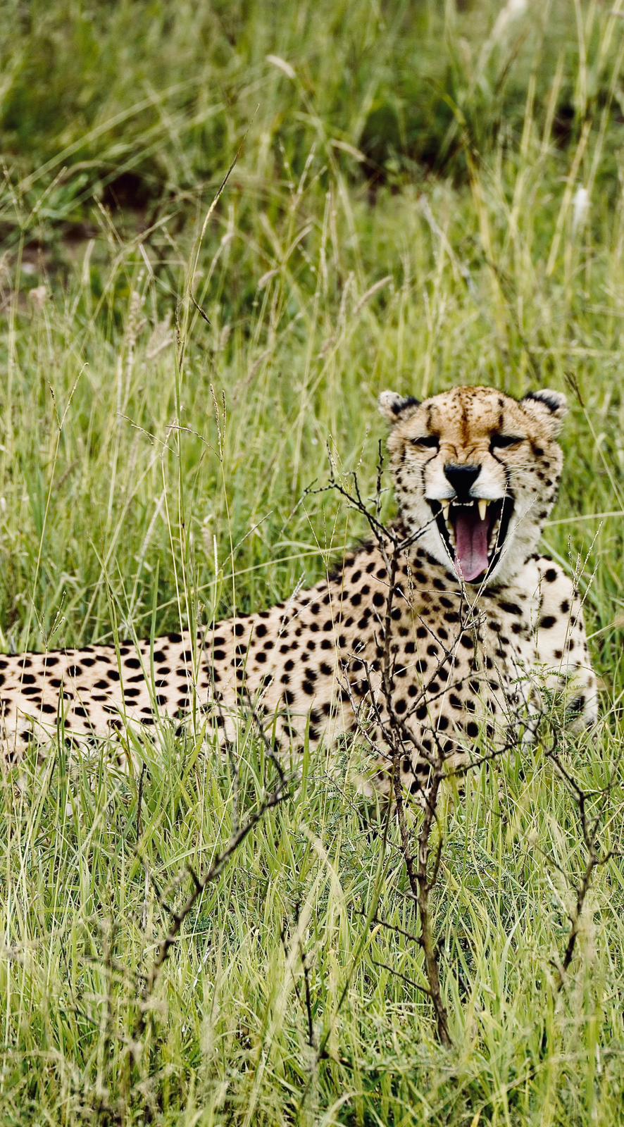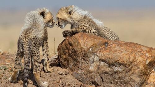 Reaching speeds of 115 kp/h (70 mph), the cheetah is the fastest land animal. It can go from 0 to 100 kph (60 mph) in just three seconds. The cheetah is the smallest of the three big cats in Africa, with the lion and leopard being the other two cats. Unlike the lion and leopard, it cannot roar. But it can purr and mew like its domestic counterparts. Another distinguishing characteristic of the cheetah is that it is a diurnal hunter, which means it hunts during the day. It prefers tall grass savannahs where it can silently watch and stalk its prey. The cheetah is a carnivore and it eats a wide range of prey, with a strong preference for various types of antelope. After a gestation period of 90 to 98 days, female cheetahs typically have a litter of three cubs (although up to nine is possible), and live with them for one and a half to two years. The cheetah's mortality is very high during the early weeks of its life; up to 90% of cheetah cubs are killed during this time by lions, leopards, hyenas, wild dogs or even by eagles.