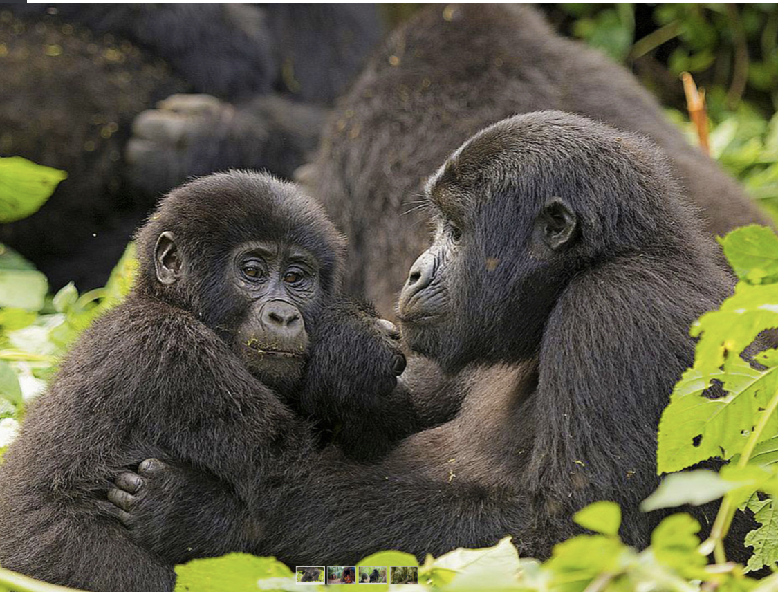 A primate and a great ape, the mountain gorilla is now only found in three African countries: DR Congo, Rwanda and Uganda. The mountain gorilla is critically endangered: somewhere from 900 to 1000 remain (last updated Nov, 2018). Mountain gorillas are very social creatures and they live in groups with one to two alpha males. Adult males are called silverback gorillas. The name comes from the silvery color that develops on their back as they mature and get older. The largest of all primates, mountan gorillas are larger than lowland gorillas and have longer hair and shorter arms. They are found at higher altitudes in the rocky slopes of dormant volcanoes. Mountain gorillas are diurnal and are most active during daylight hours. They are herbivores that feed on leaves, roots, tree bark and pulp. They have also been reported to eat small insects. The gestation period for females is nine months and they normally give birth to one young.