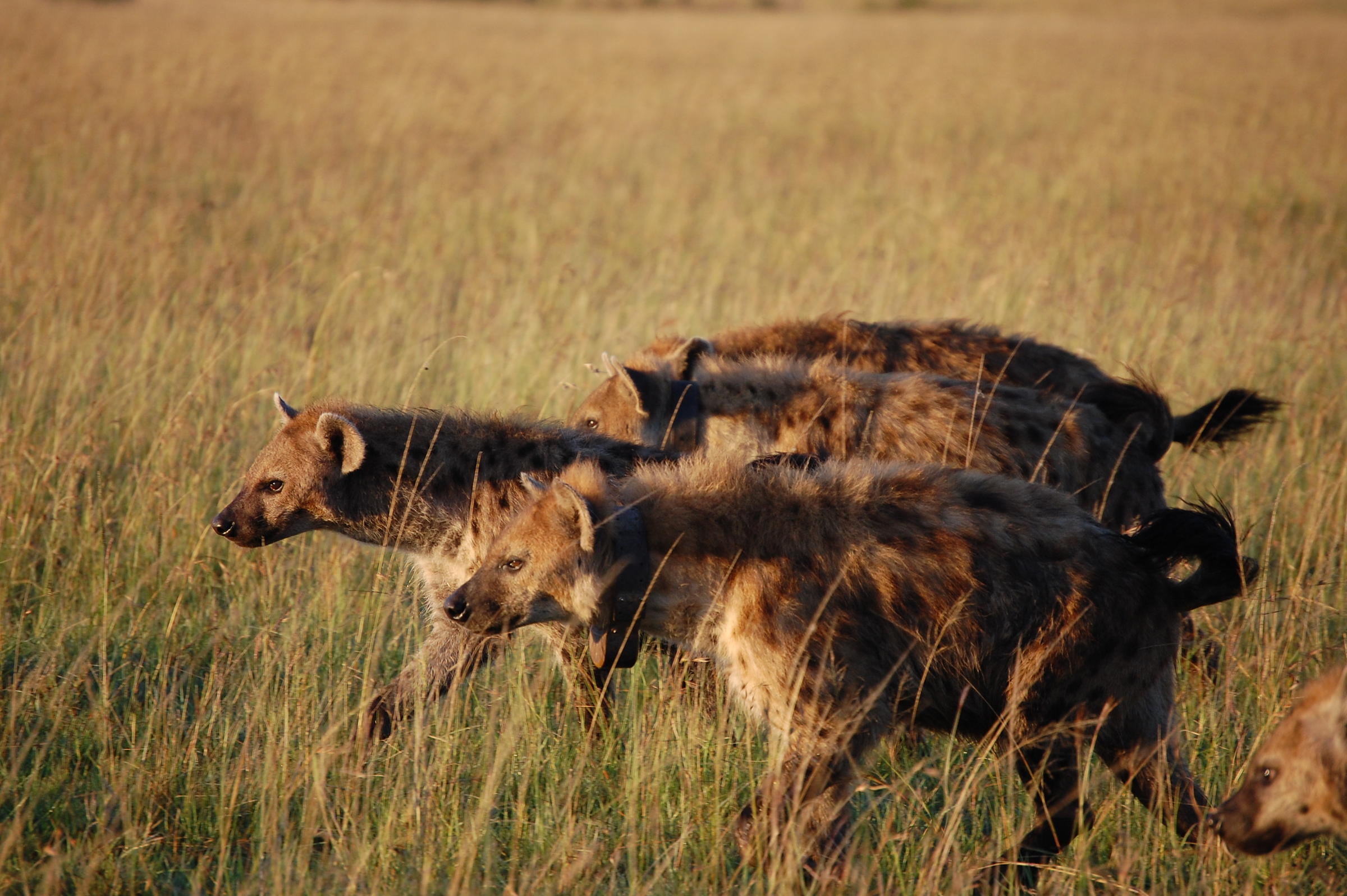 Although hyenas hunt in packs and are more active at night, they are genetically closer to felines than to canines. Hyenas live in packs called clans that can reach 80-90 animals in size. The clans are dominated by female hyenas that, when ready to breed, have a preference younger males. The average gestation period for hyenas is between 90 and 110 days, depending on specie, with the average litter size being two cubs.
