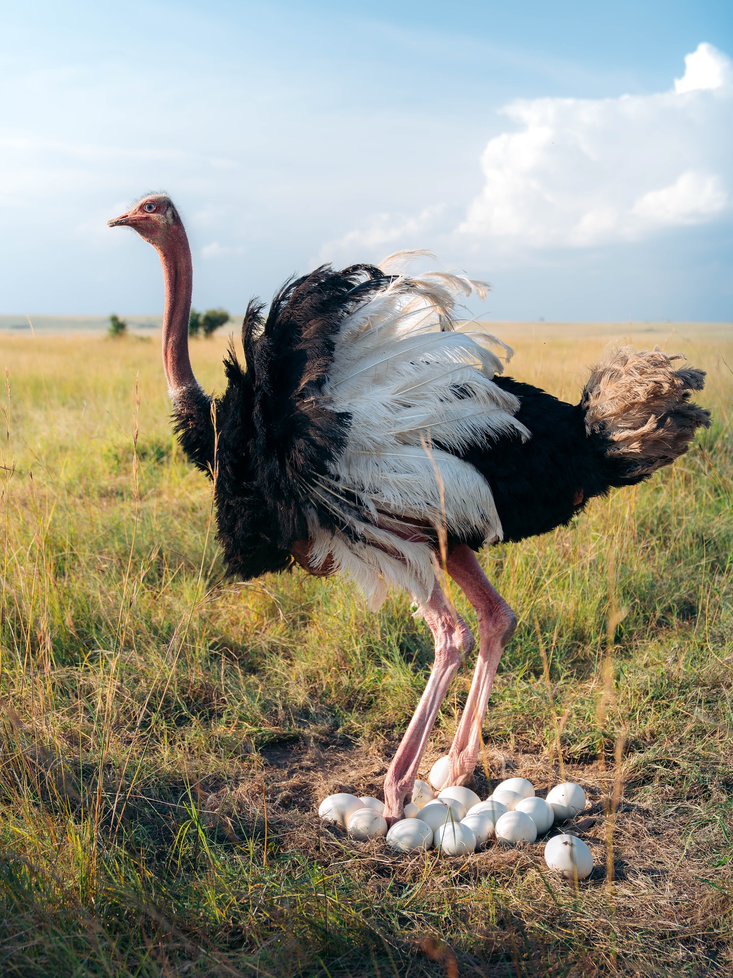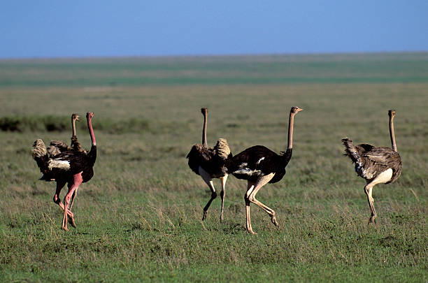 Native to Africa, the ostrich is the largest bird on earth and lays the largest of all bird eggs. Males can reach a height of up to 3 m (9 ft) and weight 160 kgs (345 lbs). Ostriches are diurnal omnivores that primarily eat grass, flowers, fruits and leaves but have also been known to eat insects. The ostrich is a very powerful bird and can move at great speeds as great as 70 kph (45 mph). Their swiftness is a great attribute to their survival, as they are flightless birds. Most predators cannot outrun them or are hard pressed to outrun them, with the obvious exception of the cheetah. Ostriches lay their eggs in a communal nest that is controlled by the alpha female who may destroy some of the other eggs in the nest. The incubation period is around 40 days, and due to high predation, less than 15% normally survive.