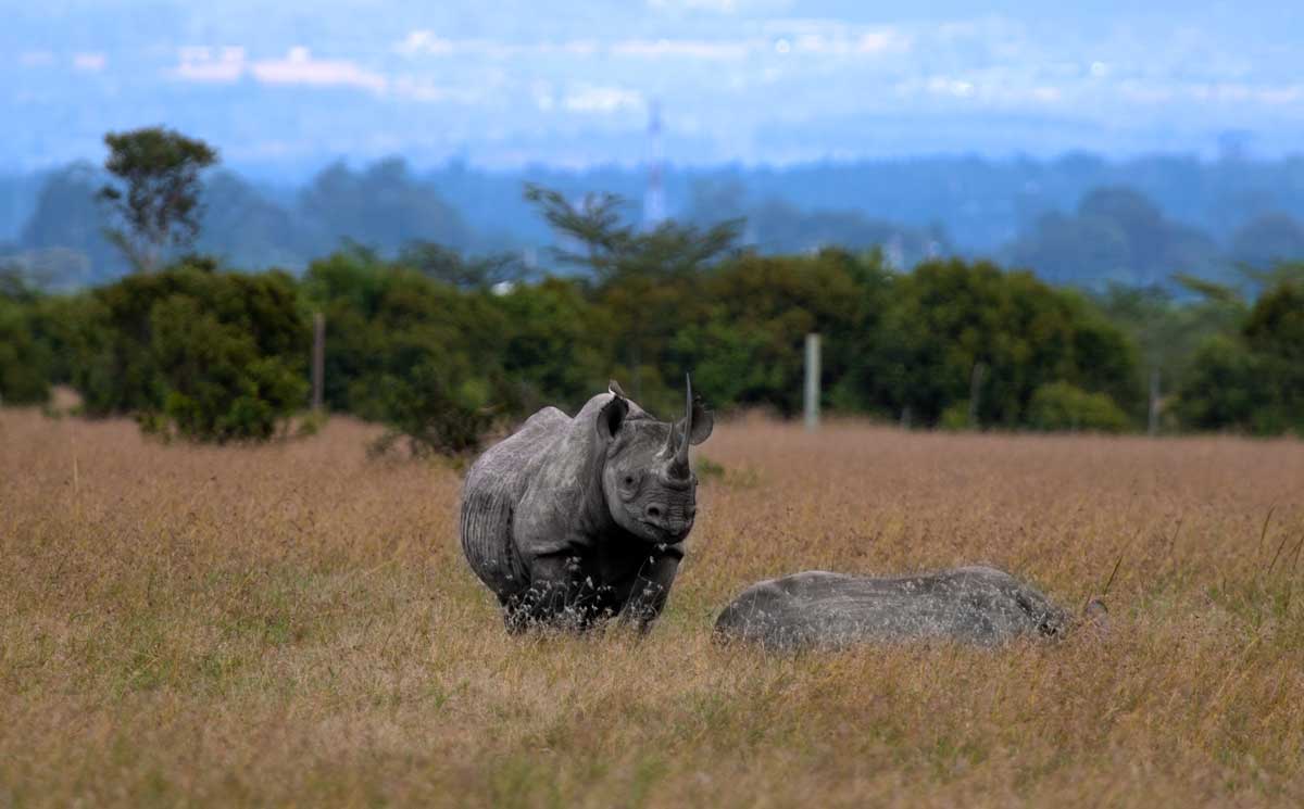 Both black and white rhinoceroses are actually gray. What distinguishes one from the other is not their color but their lip shape. The black rhino has a pointed upper lip, while its white relative has a squared lip. The difference in lip shape is related to their diets. Black rhinos get most of their sustenance from eating trees and bushes. They use their lips to pluck leaves and fruit from the branches. White rhinos graze on grasses, walking with their enormous heads and squared lips lowered to the ground. The white rhino is the larger of the two African species. It has a bigger head, due to the muscles that support its neck. Black and white rhinos have poor eyesight but an excellent sense of smell and hearing. Rhinos have a gestation period of approximately 16 months and normally have one young.