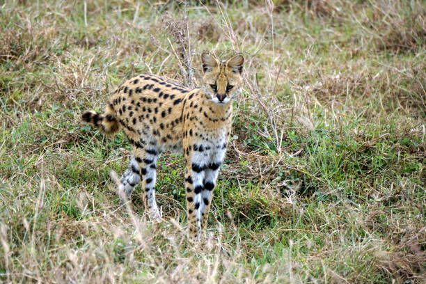 The serval cat is known in Afrikaans as Tierboskat, “tiger-backwoods feline”. It has the longest legs relative to the size of its body of all felines. Servals are found throughout sub-Saharan Africa and are known for their beautiful coat, which is a series of black spots that start out close together and slowly space apart as they work their way down the torso. Like most felines, servals are nocturnal and solitary animals. Their primary diet is rodents, but they also eat other small animals such as reptiles, hares and insects. The gestation period for females is around 65 to 80 days, with two kittens being the average litter size.